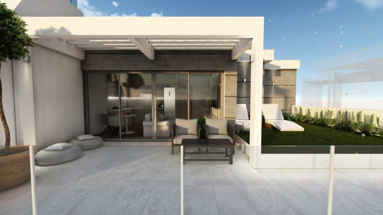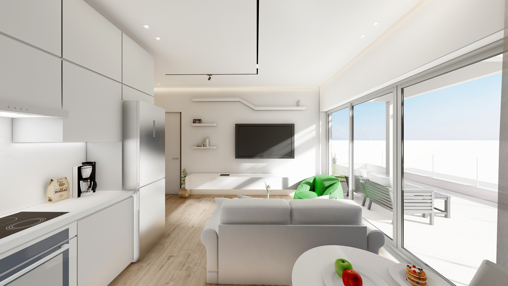 Σύγχρονος σχεδιασμός μίνιμαλ αισθητικής. Οροφοδιαμερίσματα με μεγάλα μπαλκόνια, γυάλινα πετάσματα, φυτεμένο δώμα και θερμοπρόσοψη